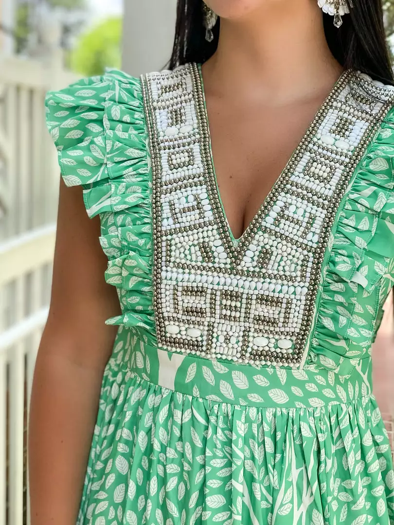 Dreamy and romantic, the Stacey features a ruffled neckline (v-neck, to accentuate and pull in the waist) with hand-embellished details. Elegantly constructed with boning laced throughout the interior of the bodice, this dress is alluring and captivating.
