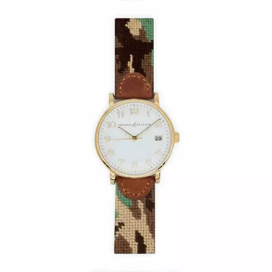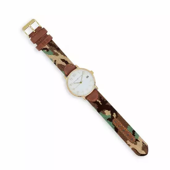 Our new needlepoint watches come in a gold or silver stainless steel case. We lined our interchangeable, hand-stitched needlepoint straps with Italian leather. When paired together, our needlepoint straps add a touch of personality to the classically designed watch case. Like our belts, our watches are packaged in a signature wooden box.