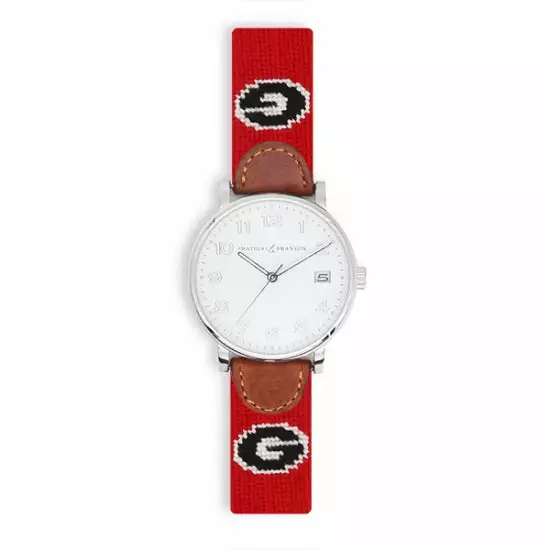 Our new needlepoint watches come in a gold or silver stainless steel case. We lined our interchangeable, hand-stitched needlepoint straps with Italian leather. When paired together, our needlepoint straps add a touch of personality to the classically designed watch case. Like our belts, our watches are packaged in a signature wooden box.