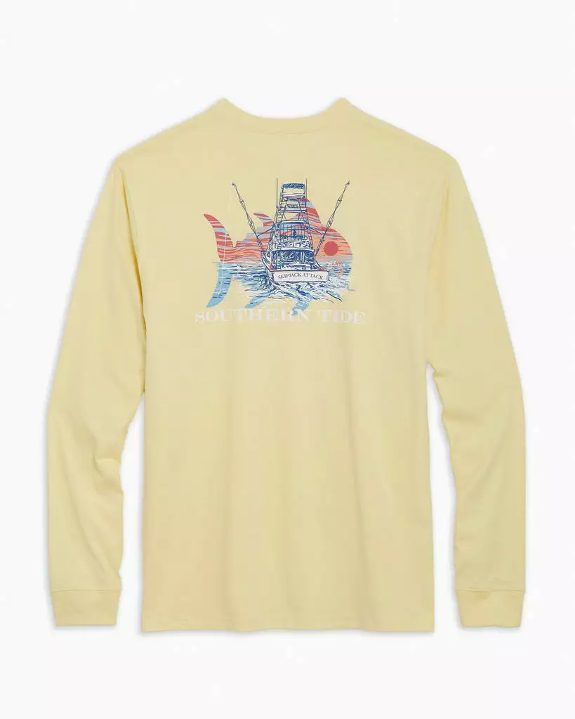 Our nautical lifestyle inspired long-sleeve t-shirt celebrates the coastal life with a boat-view sunset graphic on the back.