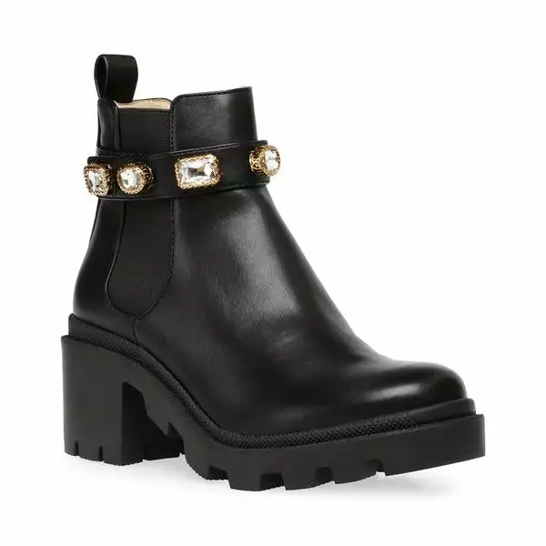 Jewelry-meets-footwear! A rhinestone-adorned strap elevates AMULET’s stretchy pull-on shaft, while a chunky heel and treaded sole provide support and stability.