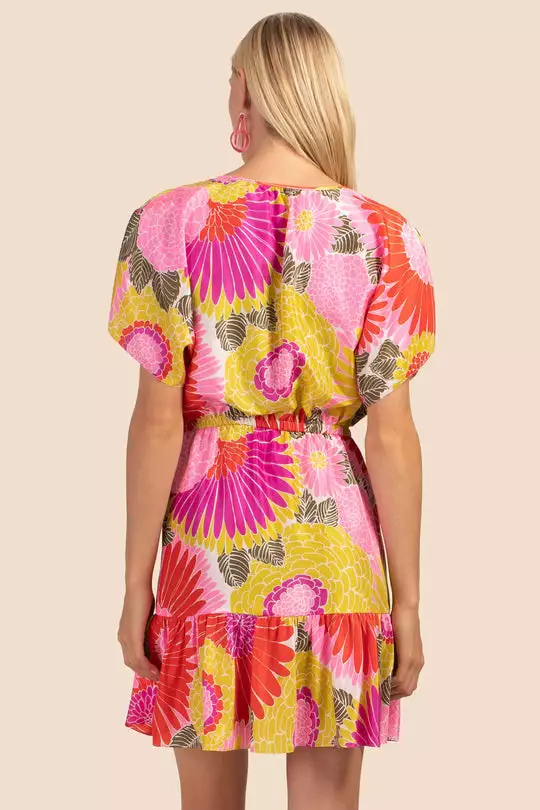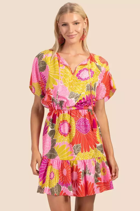 Floaty and lightweight, this short-sleeve dress features a tiered hem, elastic waist, and ties at the neck. Along with its easy, relaxed style, this soft dress features our colorful new print, boasting hues of yellow, coral, and magenta.