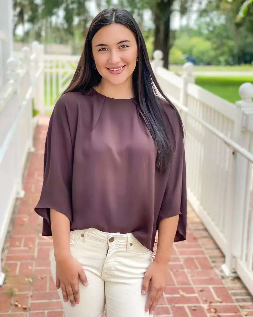 A classic, round neckline and modern front tucks create polished style to this silky top, while 3/4-length flutter sleeves add graceful femininity – a refined choice for any event, dressed up or down