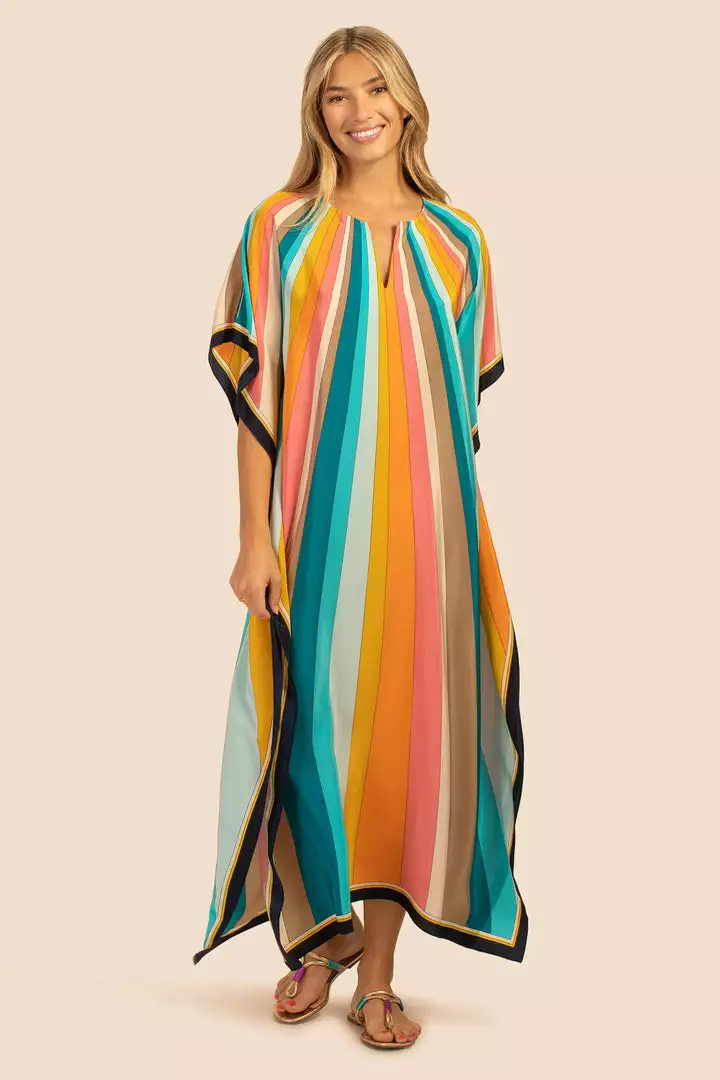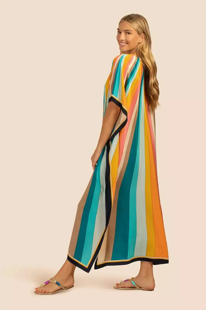 Our top-rated Theodora caftan dress is back in a new print with a burst of sunny color. In luxe silk, this sleek, maxi-dress caftan can be worn on its own, for a romantic dinner under the stars, or as a chic beach cover-up for your next holiday in the sun.