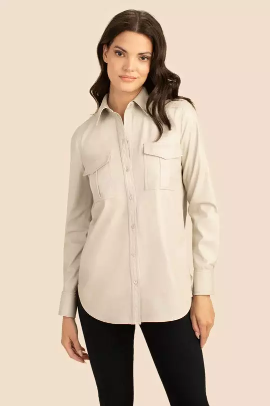 Super-soft (vegan) leather adds a luxe touch to the traditional button-up shirt.